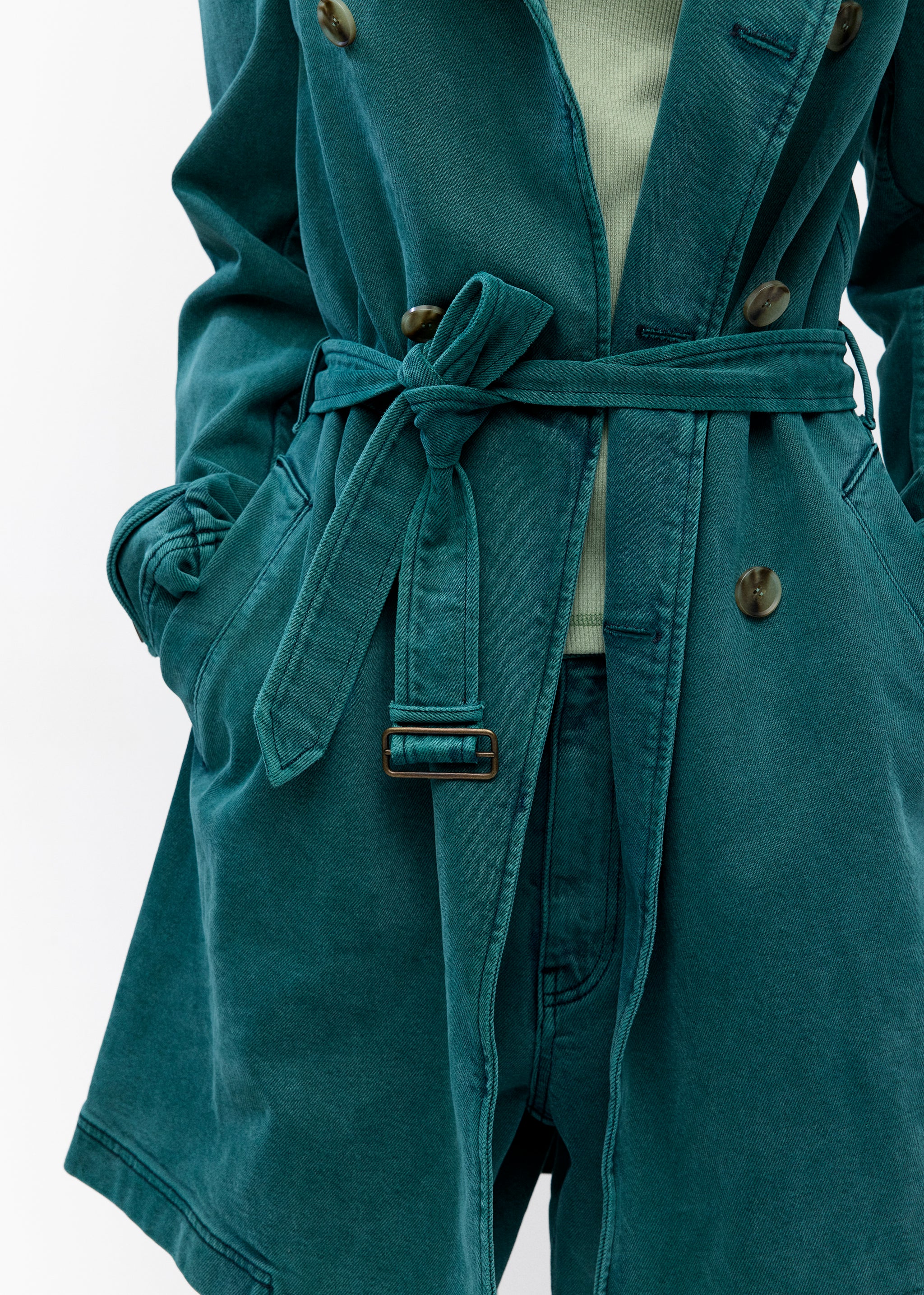 Our classic trench coat is cut in mid-weight Japanese denim to a slim, tailored fit. Garment-washed for a lived-in look, the mid-thigh-length style features classic trench details with tonal topstitching and flat-felled seams. Finished with horn buttons, it has an adjustable belt to shape the waist and a back vent for movement.