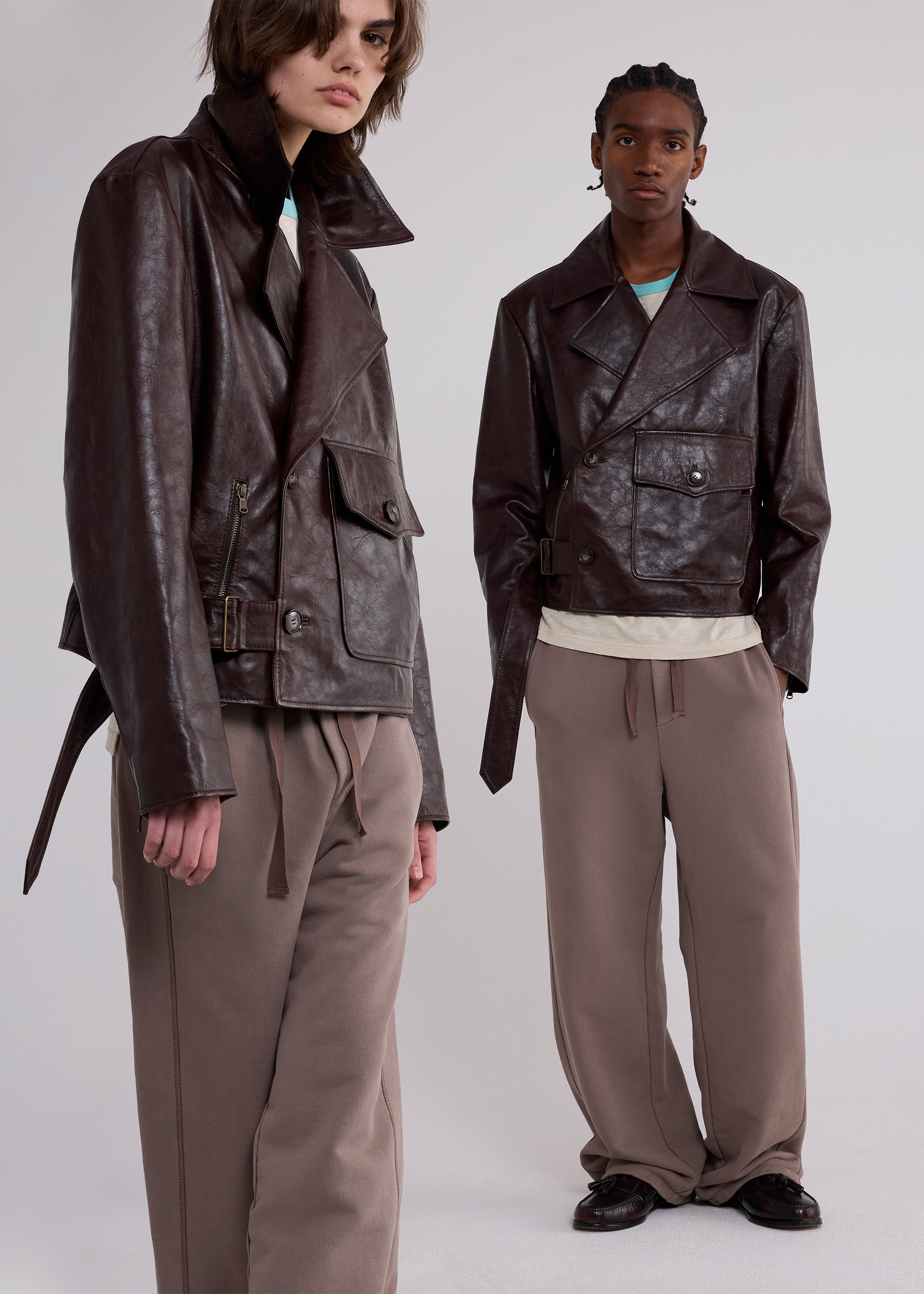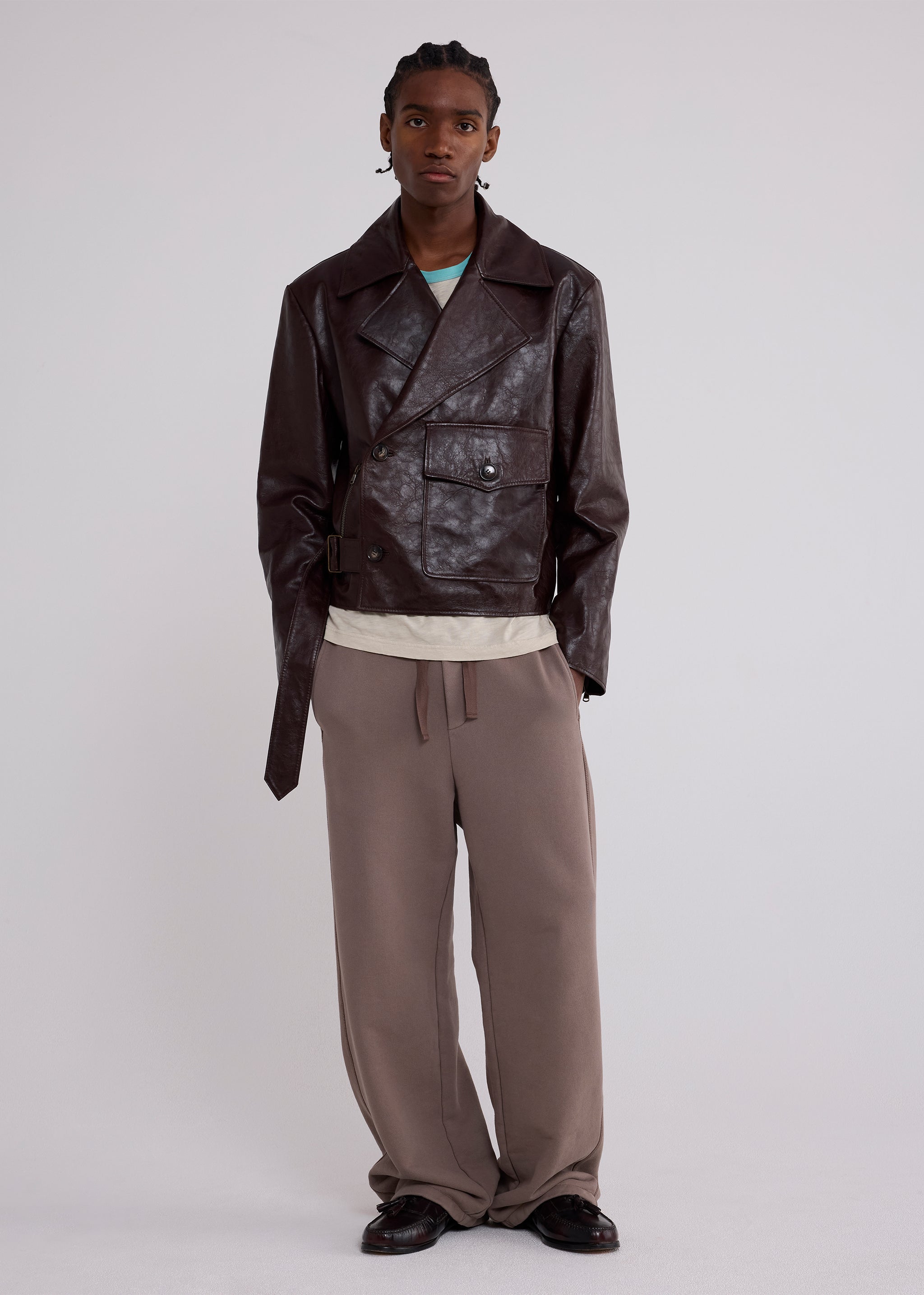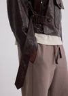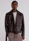 Our motorcycle jacket is crafted of soft, broken-in leather with a vintage-style feel. Cut in a relaxed double-breasted silhouette, it has an easy front with button and fixed belt closures. Asymmetrical pocketing, moto-style seam detailing, and zig-zag topstitching add subtle nods to classic riding gear.