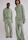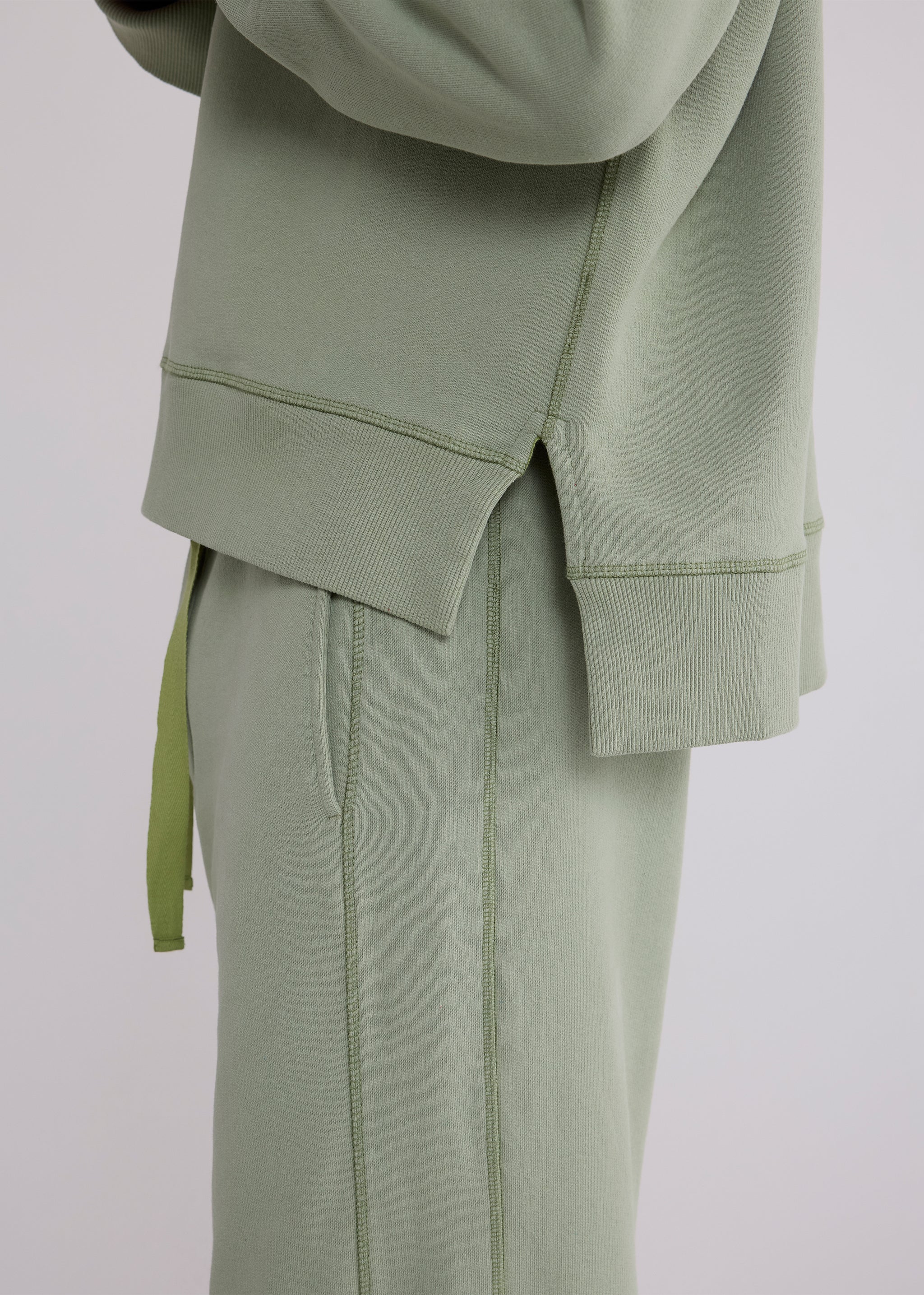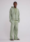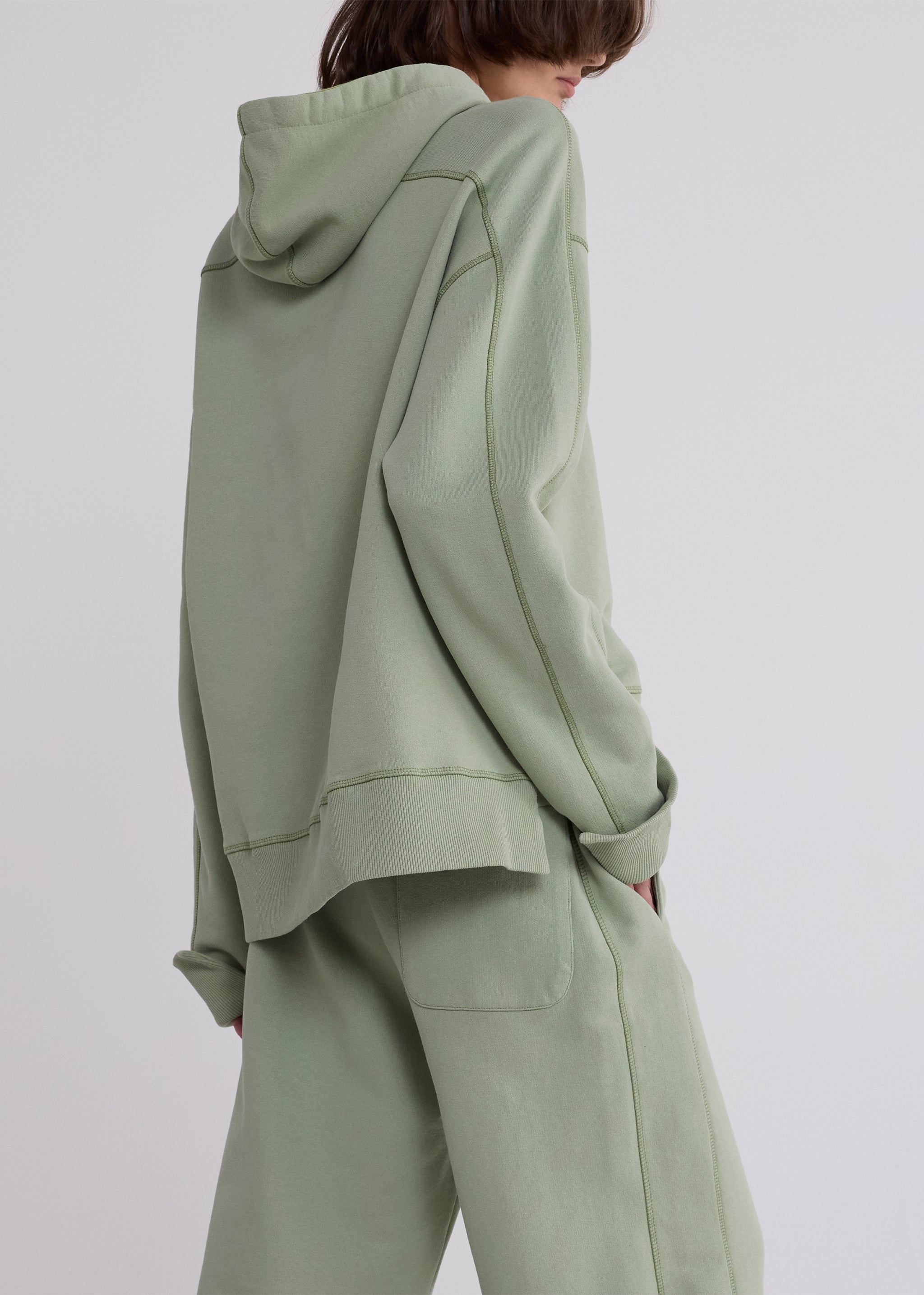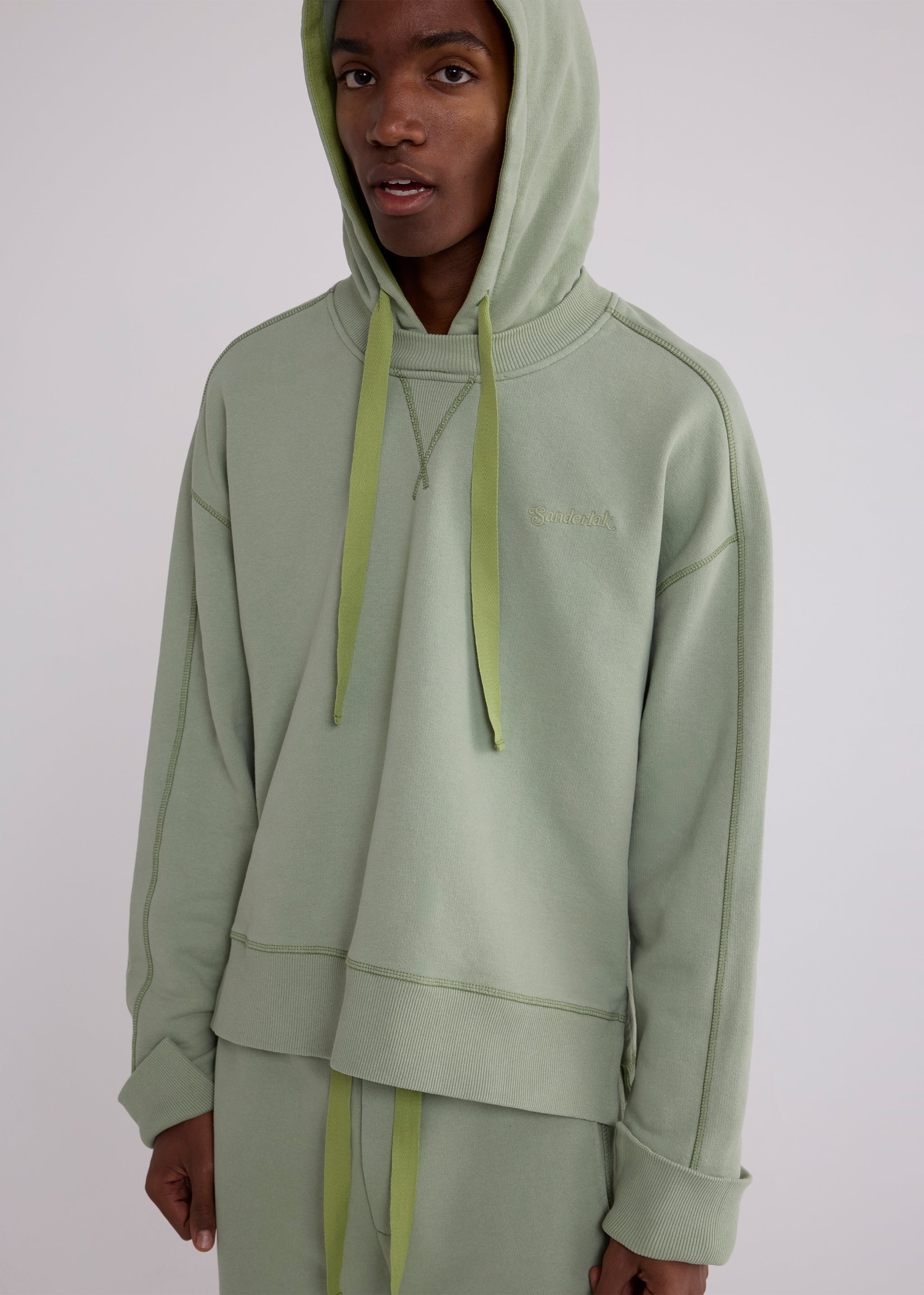 Our hoodie is crafted of soft deadstock loopback fleece in slightly-structured melange cotton jersey. Cut to a boxy, oversized fit, it features a hybrid hood-and-crew neckline with vintage-style V stitching. A stepped hem refines the relaxed silhouette, finished with tonal Sanderlak embroidery at the chest.