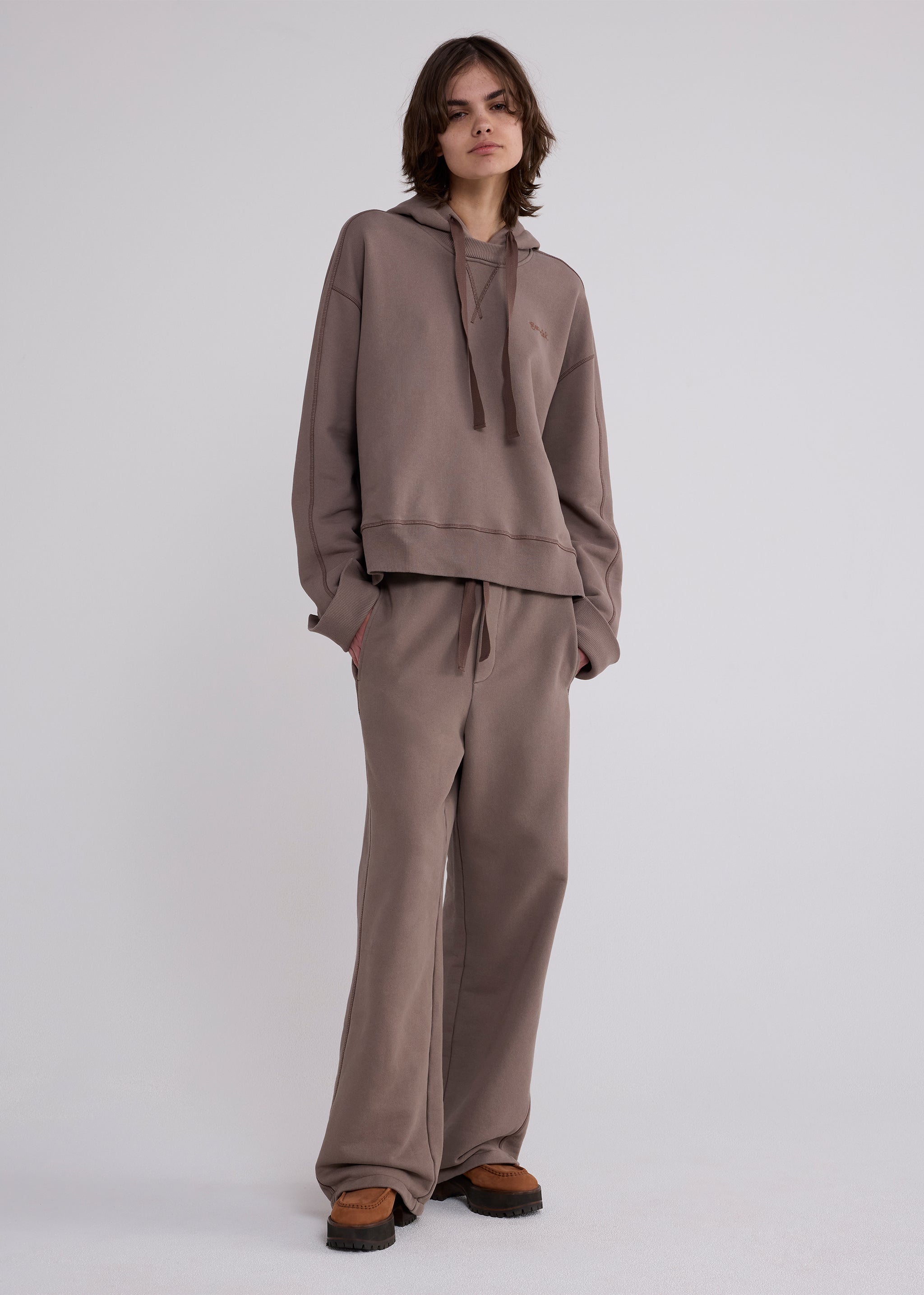 Our hoodie is crafted of soft deadstock loopback fleece in slightly-structured melange cotton jersey. Cut to a boxy, oversized fit, it features a hybrid hood-and-crew neckline with vintage-style V stitching. A stepped hem refines the relaxed silhouette, finished with tonal Sanderlak embroidery at the chest.