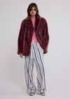 Our shearling coat is dyed in a rich berry color with a textured, color-shifting tipped finish. Cut to a relaxed, boxy silhouette, it has dropped shoulders and a double-breasted button front. Brown horn buttons and a suede undercollar impart structured poise to the plush warmth of the soft-to-the-touch fur.