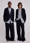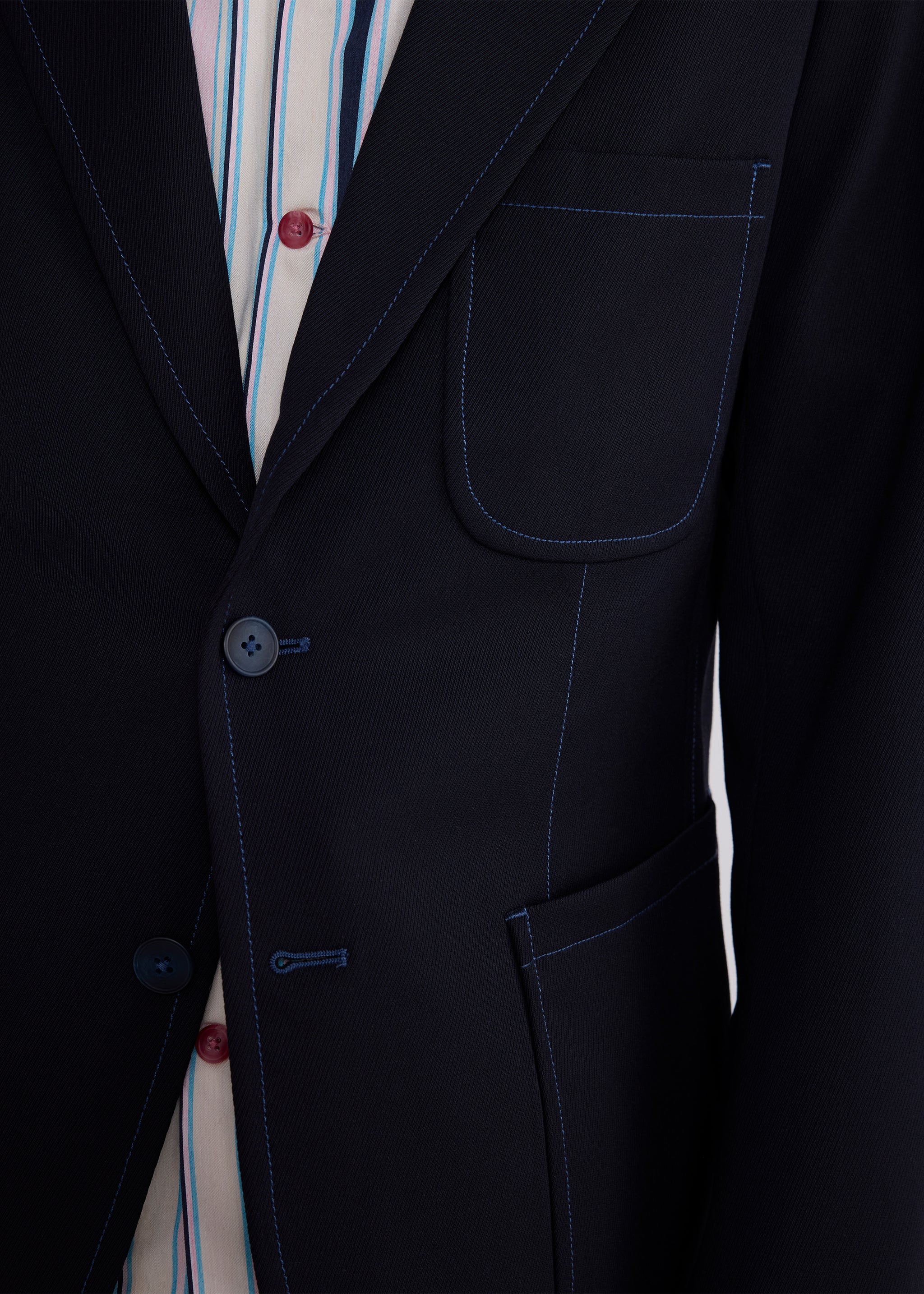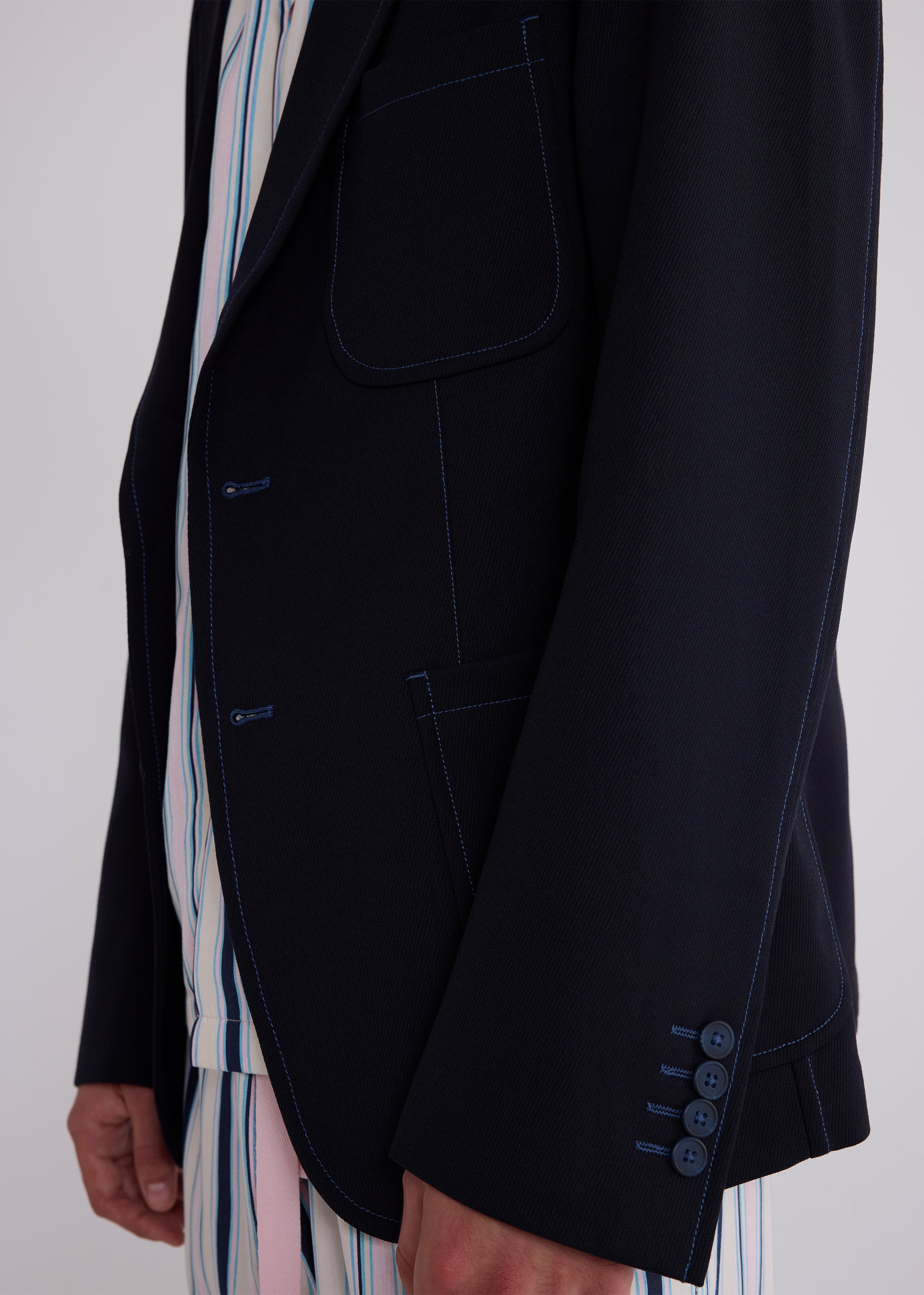 Our single-breasted blazer is cut in refined wool twill and tailored with soft structure to a narrow, close fit. The body is unlined for fluidity, and contrast topstitching accents the garment’s clean lines: rounded patch pockets and a two-button front balance quiet formality with pajama-style ease.