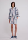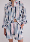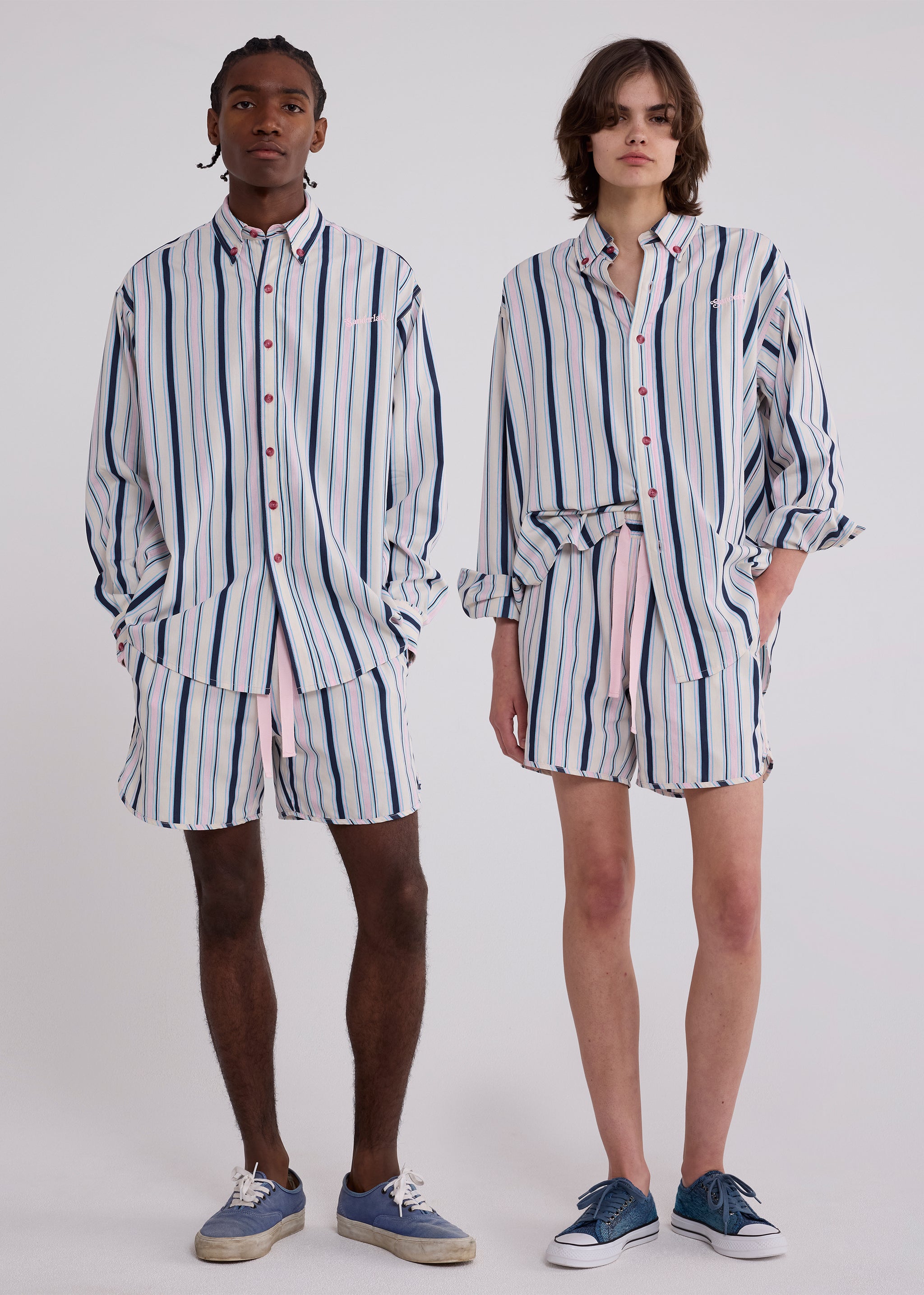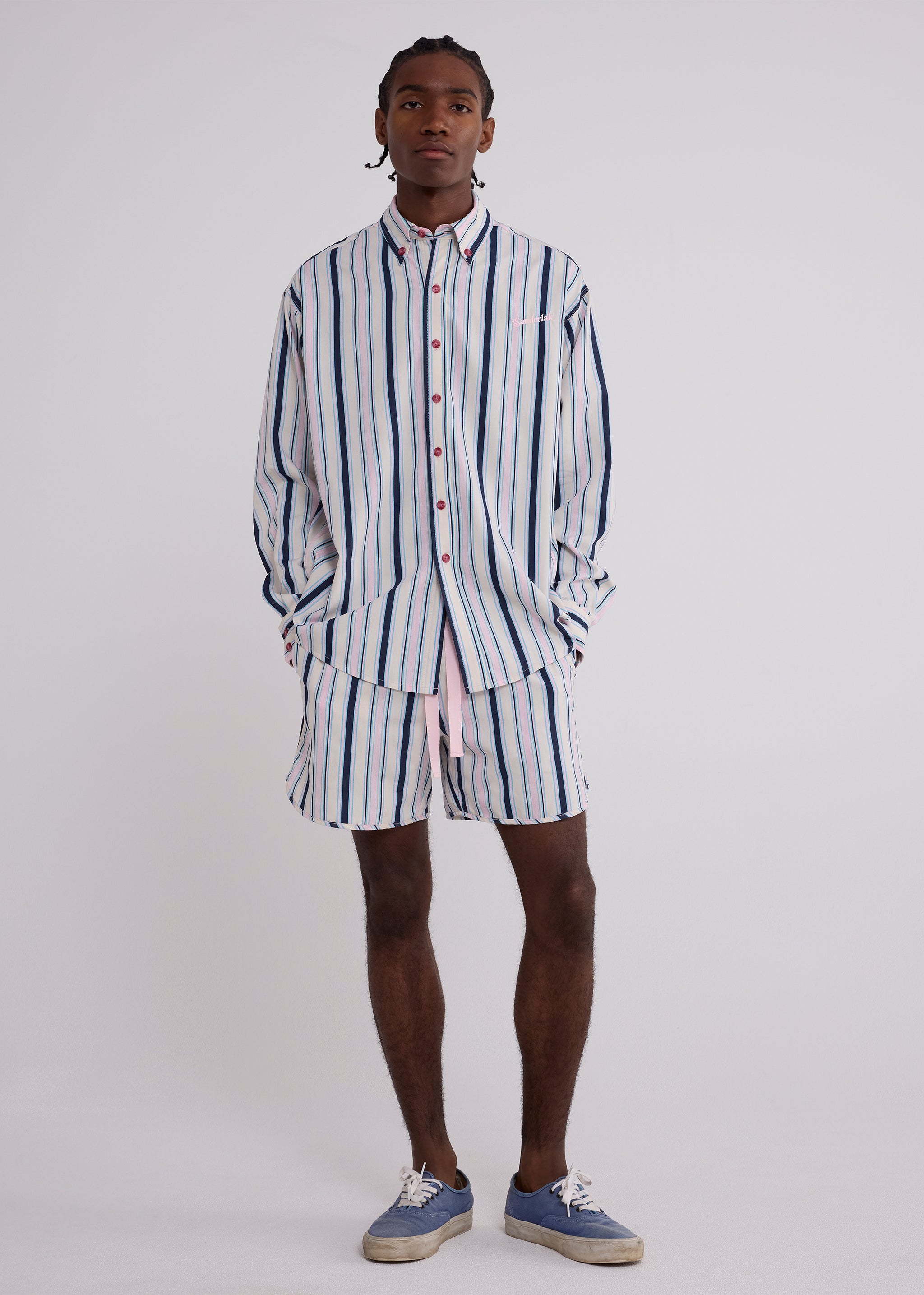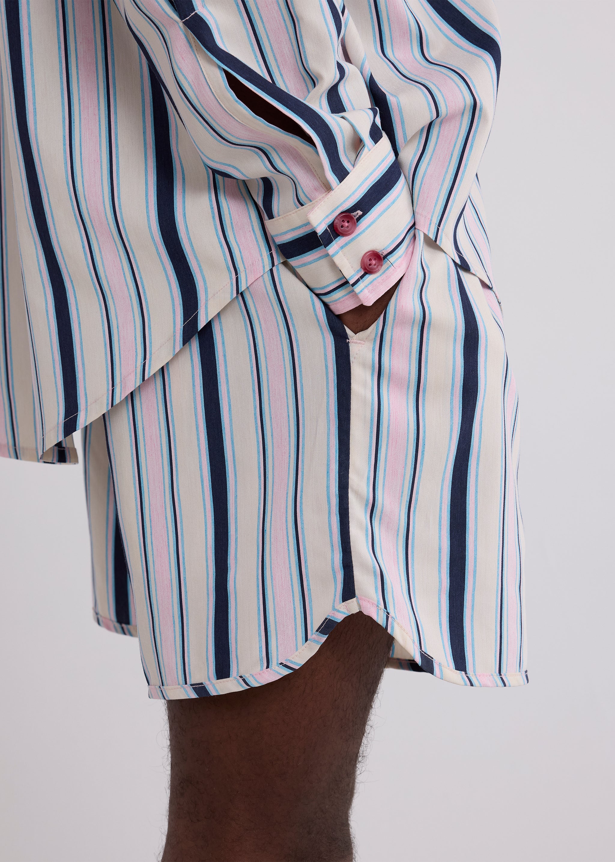 Our striped shorts are cut in dry viscose poplin that has a crisp feel with airy drape. Cut for a boxy, relaxed fit, they feature an elasticated drawstring waistband and curved side vents finished with bias piping. Side seam pockets and a single back welt pocket complete the design with polished utility.