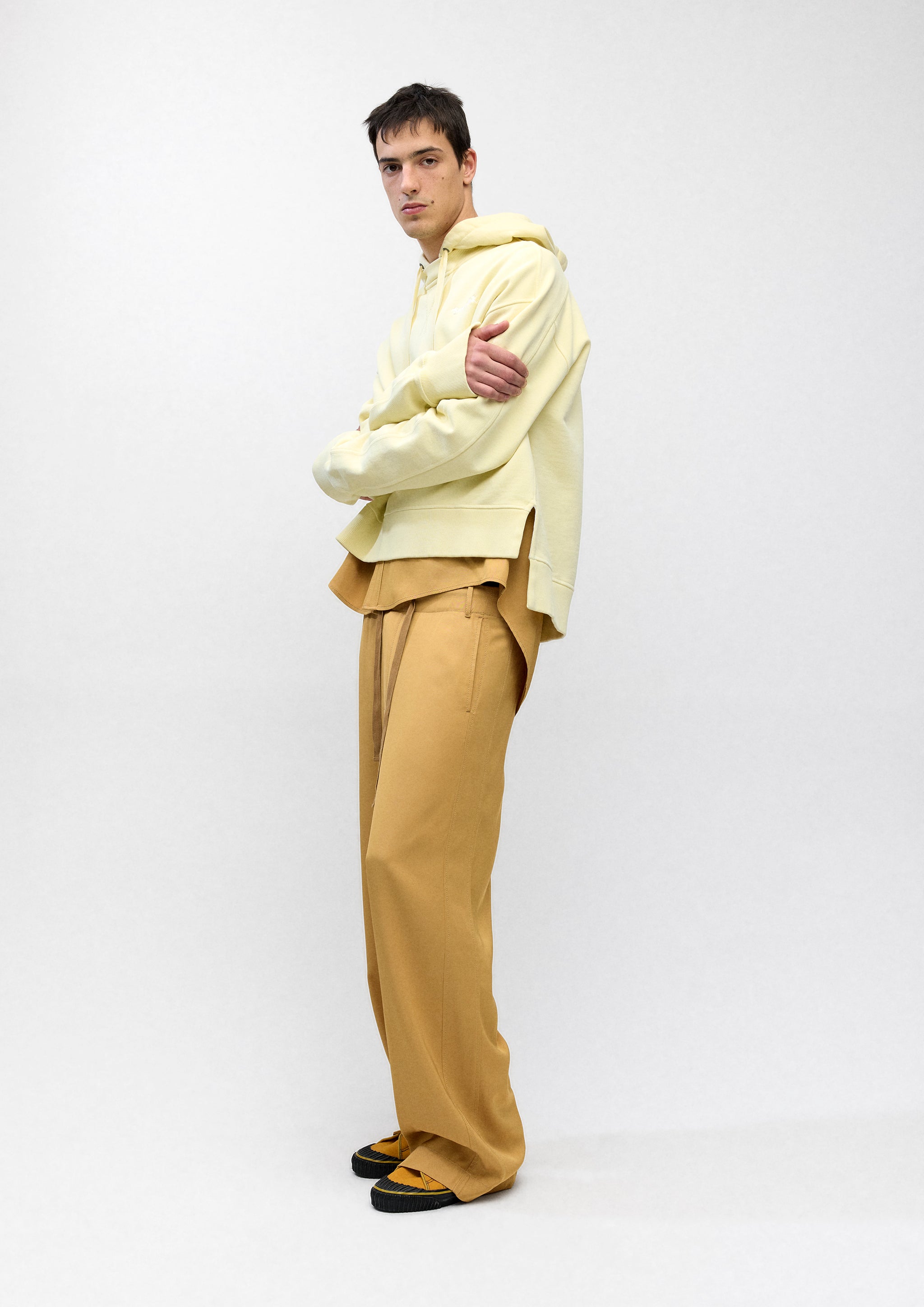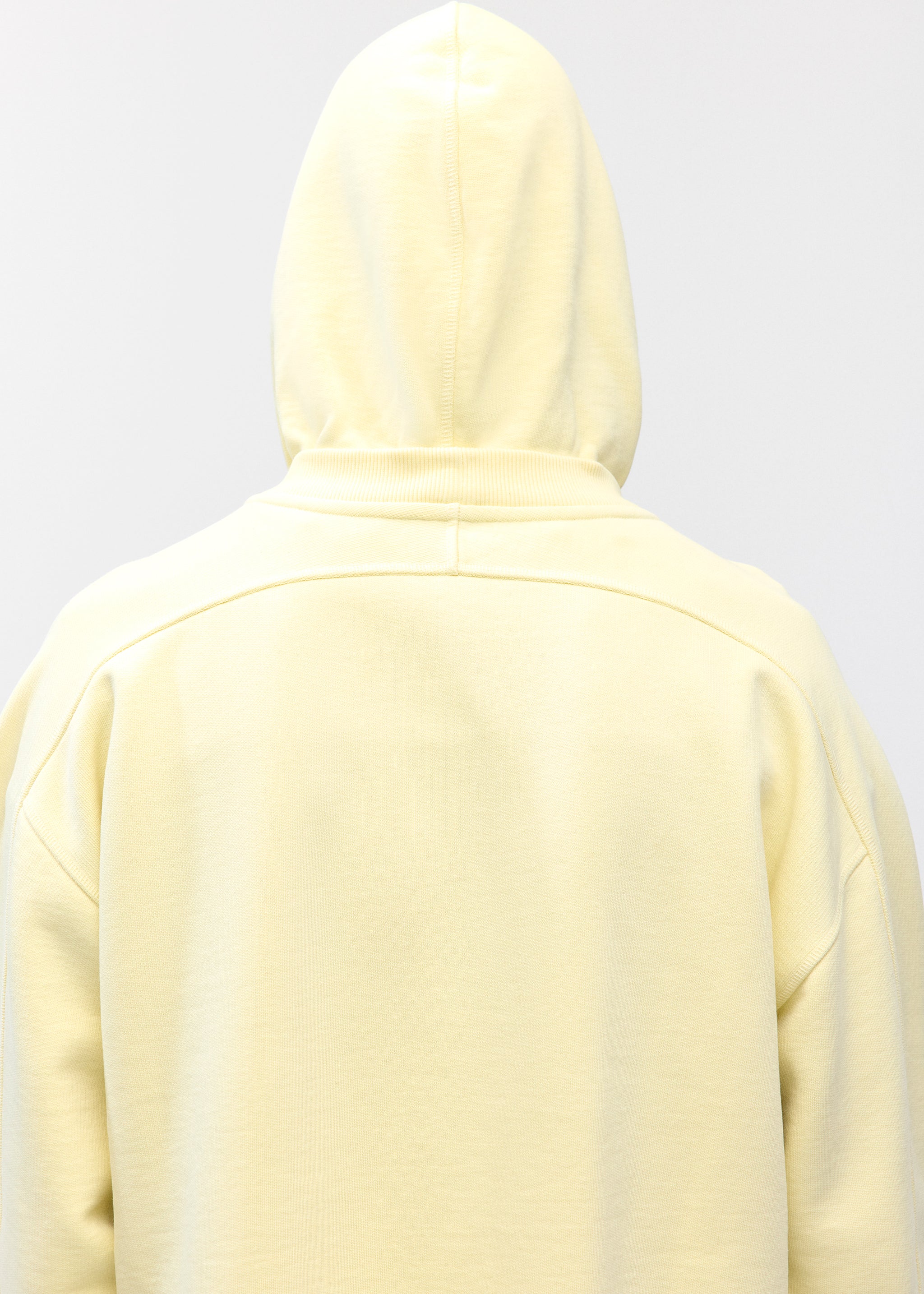 Our hoodie is crafted of soft deadstock loopback fleece in slightly-structured mid-weight cotton jersey. Cut to a boxy, oversized fit, it features a hybrid hood-and-crew neckline with vintage-style V stitching. A stepped hem refines the relaxed silhouette, finished with tonal Sanderlak embroidery at the chest.