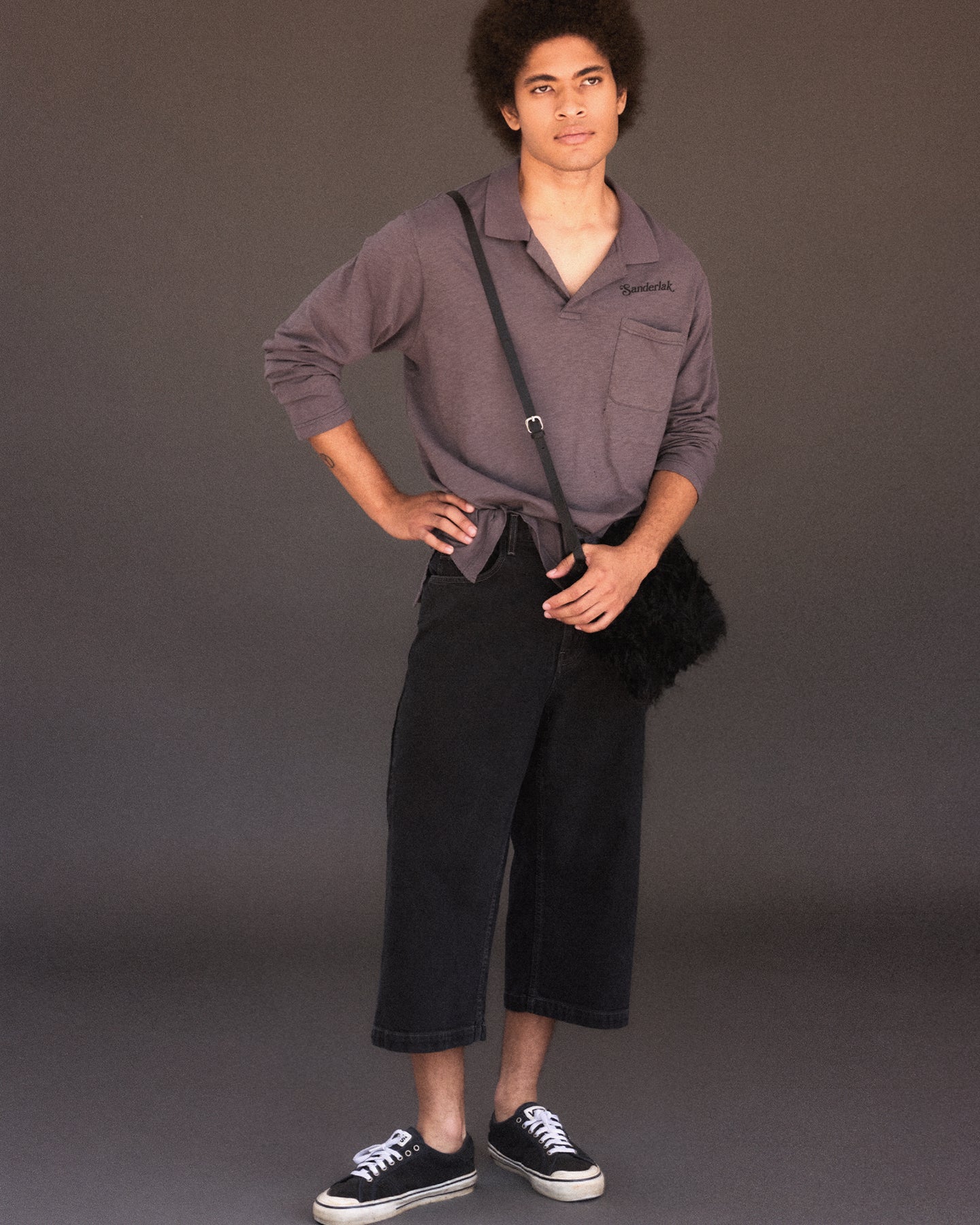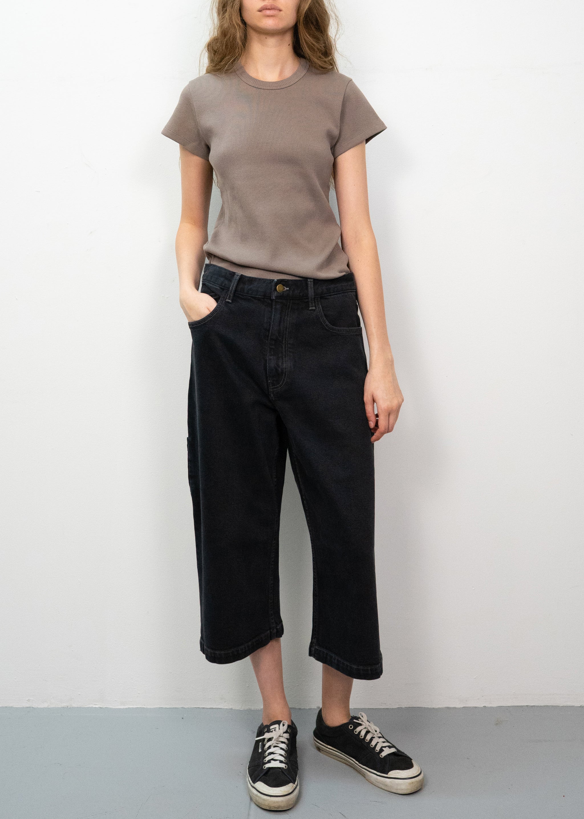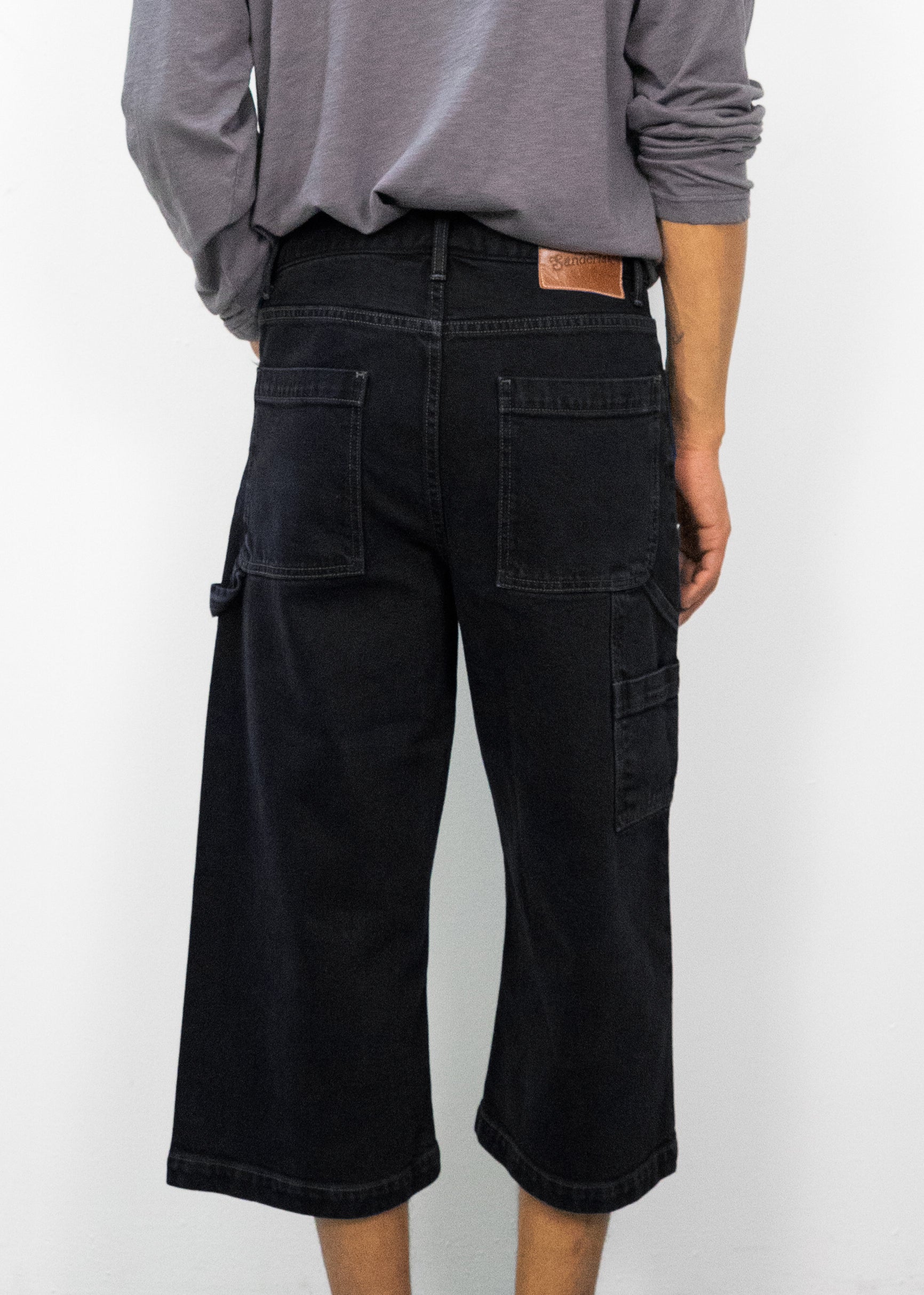 Our skater-inspired jeans have a wide, cropped silhouette. Rendered in mid-weight Japanese denim, classic five-pocket styling is updated with a utilitarian side carpenter pocket and tool loop. The style is garment-washed for a vintage feel and finished with tonal topstitching and a debossed leather logo patch at the back waist.