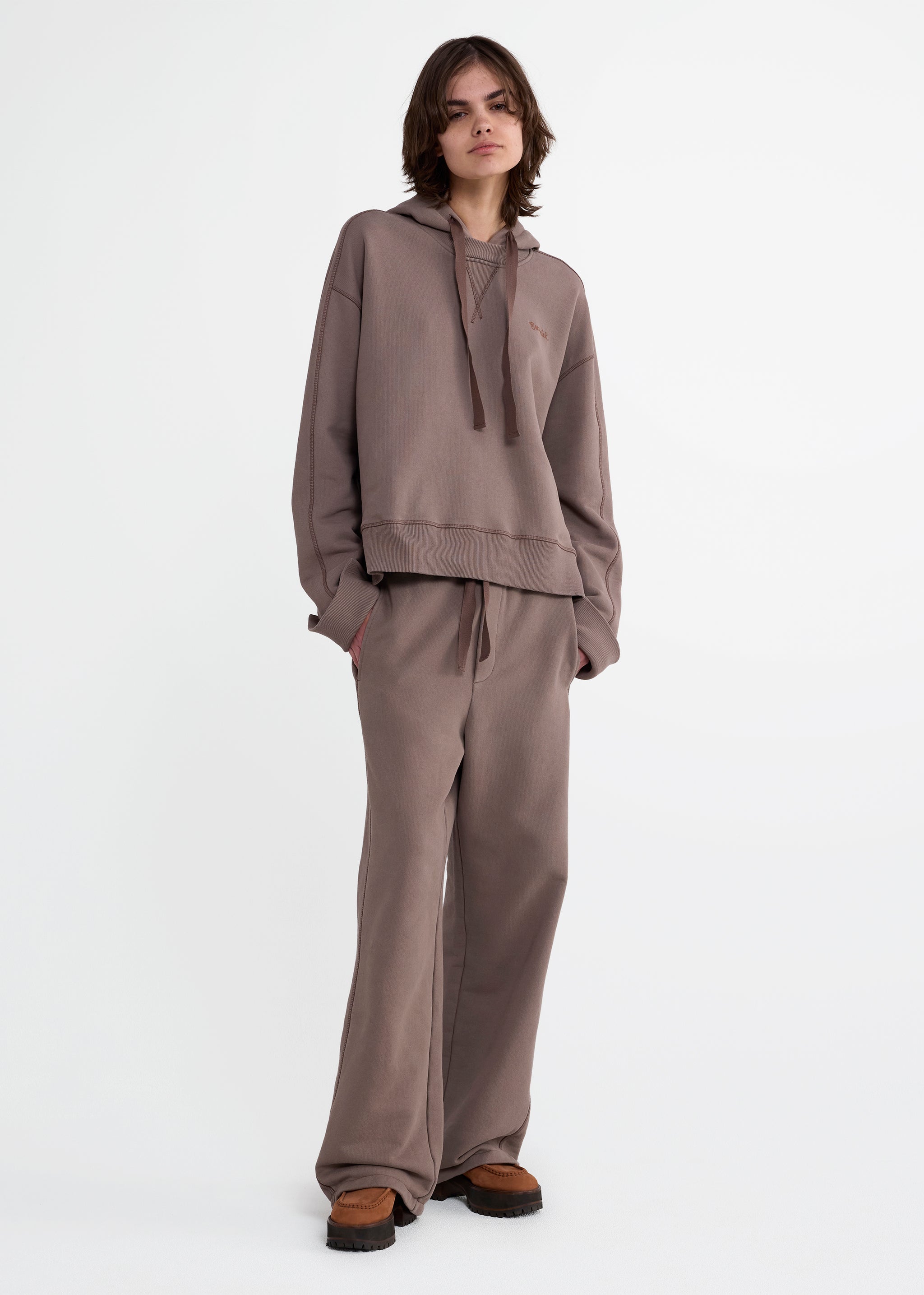 Our hoodie is crafted of soft deadstock loopback fleece in slightly-structured melange cotton jersey. Cut to a boxy, oversized fit, it features a hybrid hood-and-crew neckline with vintage-style V stitching. A stepped hem refines the relaxed silhouette, finished with tonal Sanderlak embroidery at the chest.